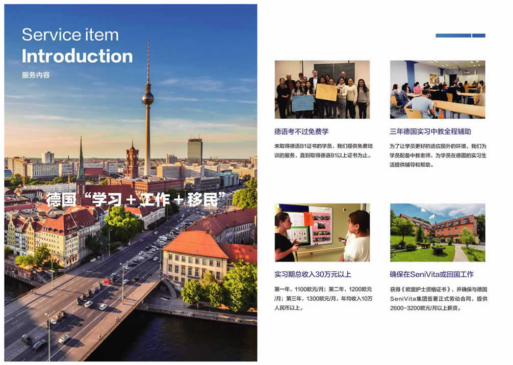 中德高级医护人才培养项目致力于帮助国内有意愿到德国发展或者有志在国内高端医疗/养老机构内从事管理等工作的人群提供一站式服务平台,为医疗护理专业技能人才搭建赴德国(欧洲)就业、深造及全家移民的桥梁!咨询电话: 张经理18600865994